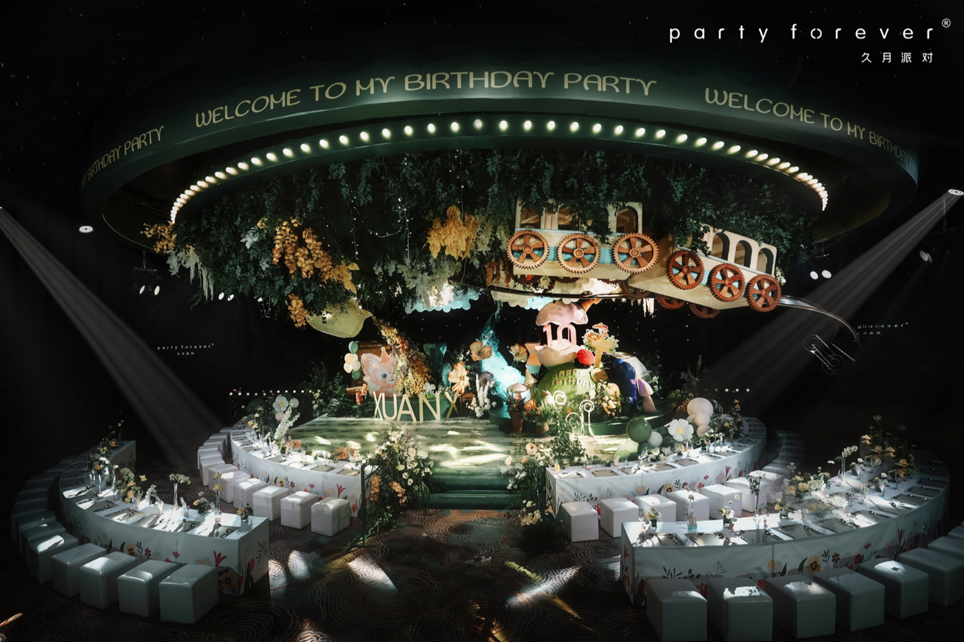 整场设计采用果绿作为主色调 暖萌的粉色系点缀其中 提取星黛露的神秘紫格外的适配 为布置增添了温馨勇敢的气息 一簇簇的气球模拟天穹中的云朵 即使云层厚重,希冀依旧能穿过云层 勇敢地洒下金黄色的光线[更多…]